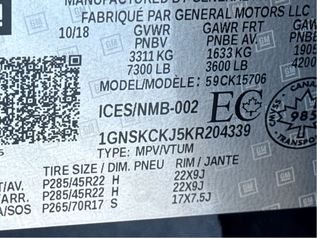 RST 6.2L Performance Edition: Unique RST Emblem; 2-Speed Electronic Autotrac Active Transfer Case; 3.23 Rear Axle Ratio; 170 Amp Alternator; 6.2L EcoTec3 V8 Engine; Electronic 10-Speed Automatic Transmission with Overdrive; Integrated Trailer Brake Controller; High-Capacity Air Cleaner. RST Edition: Black Roof Rails; Unique RST Emblem; P285/45R22 AS BW Tires; Set of 4 Wheel Locks; Front and Rear Black Bowties; 22" X 9" Gloss Black Aluminum Wheels; Black Beltline Moldings; Unique Gloss Black Sport Grille; Body-Color Door Handles and Headlamp Accents; Black Mirror Caps. Preferred Equipment Group 1LZ: Memory Settings; Heated Leather Wrapped Steering Wheel; 20" X 9" Polished-Aluminum Wheels; Perforated Leather-Appointed Seat Trim; Remote Vehicle Start; 3rd Row 60/40 Power Fold Split-Bench; Front and Rear Park Assist; Floor Console; Front Passenger 6-Way Power Seat Adjuster; 7. 300 lbs (3. 311 Kgs) GVWR; Chevrolet Infotainment AM/FM Stereo with Navigation; Enhanced Driver Alert Package; Rear Cross Traffic Alert; Fog Lamps; Driver Inboard and Front Passenger Airbags; Wireless Charging; Universal Home Remote; Color-Keyed Carpeting Floor Covering; Heated 2nd Row Seats; Hands Free Power Liftgate; 1st and 2nd Row Color-Keyed Carpeted Floor Mats; Front Heated Reclining Bucket Seats; Cargo Net; Power-Folding Heated Outside Mirrors; Lane Change Alert with Side Blind Zone Alert; Electronic Cruise Control with Set and Resume Speed; 5 12-Volt Auxiliary Power Outlets; SiriusXM Radio; Single-Speed Elec Autotrac Active Transfer Case; Black Assist Steps with Chrome Accent Strip; P275/55R20 AS BW Tires; Heated and Ventilated Driver and Front Passenger Seats; Power Tilt and Telescopic Steering Column; Roof-Mounted Luggage Rack Side Rails; Passive Entry System; Bose Centerpoint Premium 10-Speaker Surround Sound; Magnetic Ride Control Suspension Package; SiriusXM NavTraffic; Auto-Dimming Inside Rearview Mirror; Power-Adjustable Accelerator and Brake Pedals; Push Button Keyless Start; Power Release 2nd Row Bucket Seats; 4-Wheel Antilock Disc Brakes with Brake Assist; Memory Settings; Heated Leather Wrapped Steering Wheel; 20" X 9" Polished-Aluminum Wheels; Perforated Leather-Appointed Seat Trim; Remote Vehicle Start; 3rd Row 60/40 Power Fold Split-Bench; Front and Rear Park Assist; Floor Console; Front Passenger 6-Way Power Seat Adjuster; 7. 300 lbs (3. 311 Kgs) GVWR; Chevrolet Infotainment AM/FM Stereo with Navigation; Enhanced Driver Alert Package; Rear Cross Traffic Alert; Fog Lamps; Driver Inboard and Front Passenger Airbags; Wireless Charging; Universal Home Remote; Color-Keyed Carpeting Floor Covering; Heated 2nd Row Seats; Hands Free Power Liftgate; 1st and 2nd Row Color-Keyed Carpeted Floor Mats; Front Heated Reclining Bucket Seats; Cargo Net; Power-Folding Heated Outside Mirrors; Lane Change Alert with Side Blind Zone Alert; Electronic Cruise Control with Set and Resume Speed; 5 12-Volt Auxiliary Power Outlets; SiriusXM Radio; Single-Speed Elec Autotrac Active Transfer Case; Black Assist Steps with Chrome Accent Strip; P275/55R20 AS BW Tires; Heated and Ventilated Driver and Front Passenger Seats; Power Tilt and Telescopic Steering Column; Roof-Mounted Luggage Rack Side Rails; Passive Entry System; Bose Centerpoint Premium 10-Speaker Surround Sound; Magnetic Ride Control Suspension Package; SiriusXM NavTraffic; Auto-Dimming Inside Rearview Mirror; Power-Adjustable Accelerator and Brake Pedals; Push Button Keyless Start; Power Release 2nd Row Bucket Seats; 4-Wheel Antilock Disc Brakes with Brake Assist. Interior Protection Package: All-Weather Rear Cargo Mat; All-Weather Floor Mats. Enhanced Driver Information Center: Head-Up Display. Body Security Content Theft Protection Package: Theft-Deterrent Alarm System; Vehicle Interior Movement Sensor; Vehicle Inclination Sensor. Power Sunroof. All-Weather Floor Mats. Reflective Window Shade. All-Weather Rear Cargo Mat. Set of 4 Wheel Locks. Front Console Organizer with Storage Bin. **Equipment listed is based on original vehicle build and subject to change. Please confirm the accuracy of the included equipment by calling the dealer prior to purchase.**