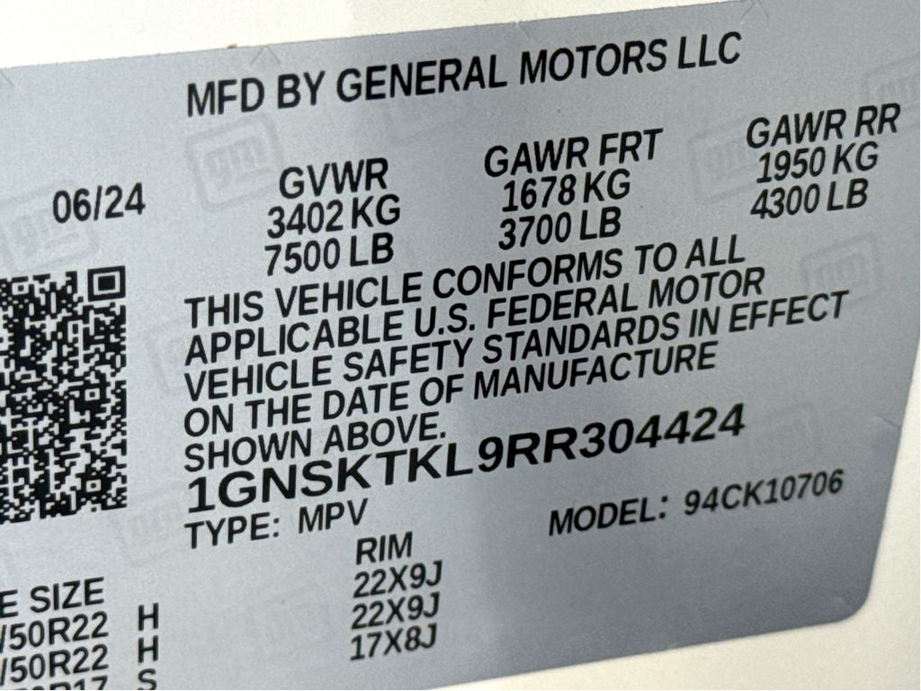 Max Trailering Package: Extra Capacity Cooling System. Advanced Trailering Package: Trailer Side Blind Zone Alert; Smart Trailer Integration Indicator; Integrated Trailer Brake Controller; Hitch View with Pan/zoom Image Adjustment. Advanced Technology Package: Enhanced Automatic Parking Assist; Super Cruise; Reverse Automatic Braking. Preferred Equipment Group 3LZ: Bright Front and Rear Door Sill Plates; Memory Settings; Perforated Leather Seat Trim; Remote Start; 3rd Row 60/40 Power-Folding Split-Bench Seat; Safety Alert Seat; Chrome Door Handles with Body-Color Strip; Hill Descent Control; 6.2L EcoTec3 V8 Engine; Rear Camera Mirror Washer; Inside Rearview Auo-Dimming Rear Camera Mirror; Heated Steering Wheel; LED Daytime Running Lamps; Rear Cross Traffic Alert; Wheels: 22" X 9" Sterling Silver Premium Painted; Driver and Front Outboard Passenger Airbags; Wireless Charging; Front High-Back Reclining Bucket Seats; Adaptive Cruise Control; Universal Home Remote; Color-Keyed Carpeting Floor Covering; Heated 2nd Row Outboard Seats; Hands-Free Rear Power Programmable Liftgate; Chevrolet Infotainment 3 Premium System Radio; 2-Speed Active Electronic Autotrac Transfer Case; 1st and 2nd Row Color-Keyed Carpeted Floor Mats; Enhanced Driver Information Center; Floor Console; Lane Change Alert with Side Blind Zone Alert; Dual Exhaust System; SiriusXM with 360L; HD Surround Vision; Wrapped Steering Wheel; Power Tilt and Telescopic Steering Column; 15" Diagonal Multi-Color Head-Up Display; Rear Pedestrian Alert; Bose 10-Speaker Centerpoint Surround Audio System Feature; Magnetic Ride Control Suspension; Power Release 2nd Row Bucket Seats; Enhanced Automatic Emergency Braking; 275/50R22SL AS BW Tires; Outside Heated Power-Adjustable Mirrors. Rear Seat Media System. Dual-Pane Power Panoramic Sunroof. Air Ride Adaptive Suspension. Iridescent Pearl Tricoat. 1st. 2nd & 3rd Rows All-Weather Floor Liners (LPO). Front and Rear Black Bowtie Emblems. Reverse Automatic Braking. **Equipment listed is based on original vehicle build and subject to change. Please confirm the accuracy of the included equipment by calling the dealer prior to purchase.**